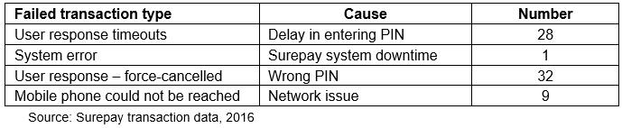 Table 1: Number and cause of failed Surepay transactions