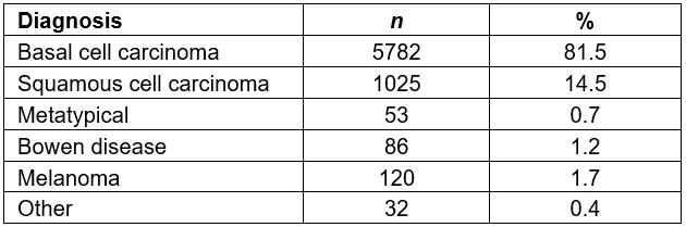 A total of 45 872 patients with suspected skin cancer were evaluated at the MU from 2004 to 2013, with an average of 4587 patients seen per year at the MU. Of these, 8954 surgical procedures (excision and/or biopsy) were performed. These patients had a mean age of 64 years, and 50.3% were men and 49.7% were women from nine Brazilian states (São Paulo, Minas Gerais, Goiás, Mato Grosso, Mato Grosso do Sul, Tocantins, Pará, Rondônia, Santa Catarina) (Table 1). The youngest patient was a 21-year-old man, from the state of Rondônia, with a diagnosis of squamous cell carcinoma. The oldest patient was a 99-year-old woman, from the state of Minas Gerais, with a diagnosis of basal cell carcinoma. Among the patients undergoing surgical procedures, 7098 (15.5%) received pathological confirmation of the malignancy. The other 38 774 (84.5%) patients without suspected skin cancer lesions were instructed to continue follow-up with their general practitioner. In relation to malignant lesions, 81.5% had basal cell subtype, 14.5% squamous cell, 1.7% melanoma, 0.7% metatypical, 1.2% Bowen disease, and 0.4% had two other subtypes (dermatofibrosarcoma and Merkel cell) (Table 2). Among the nonmelanoma cancers, 85.7% were diagnosed at stage 0 or 1, whereas 85.9% of the melanomas were diagnosed at stage 0 or 1 (Table 3). Two cases of Merkel cell carcinoma were diagnosed, one patient at stage 2; the other patient chose to continue treatment at a different hospital unit, and hence the BCH do not have follow-up data. Two cases of dermatofibrosarcoma were diagnosed, one at stage 3; the other patient also preferred to continue treatment at another hospital unit.