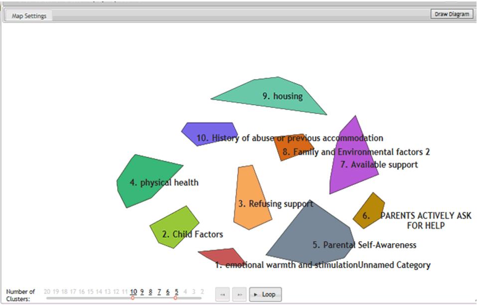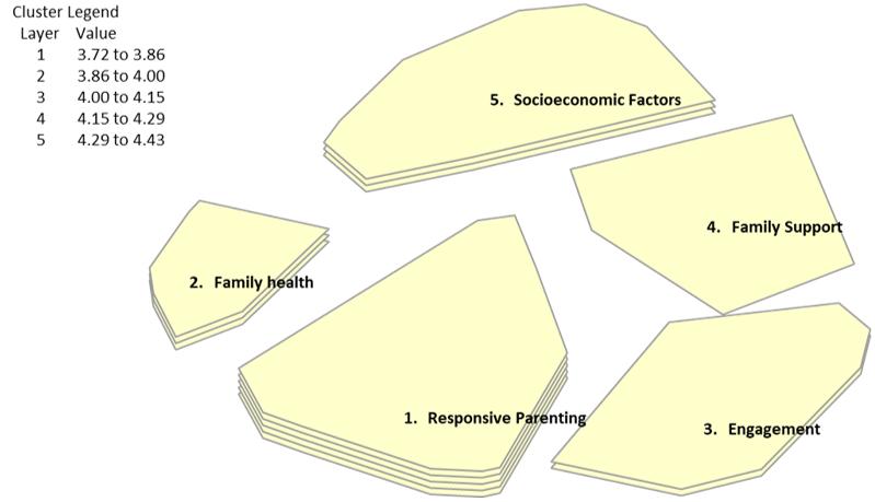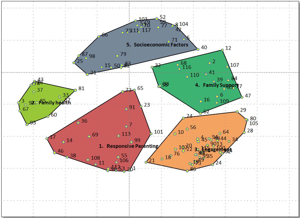 Family resilience was agreed by health visitors in Wales to comprise five clusters: ‘family health’, ‘responsive parenting’, ‘engagement’, ‘family support’ and ‘socioeconomic factors’. In total there were 117 statements generated and underpinning the five clusters of family resilience. This data was developed in preparation for building a family resilience assessment tool and instrument for use in health visitor daily practice as required by Welsh Government policy. The concept map was subject to further testing during tool development and validation within a high-fidelity simulation suite on two occasions and in practice with health visitors between 2015 and 2017.