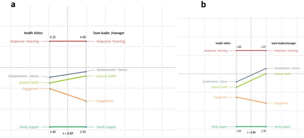 The group then discussed how the statements were grouped in clusters together. Although all data are used within the final cluster map, the number of visual clusters decided in the final generated map depended on the visible detail required for the development of the FRAIT and a discussion on the ability of individuals to comfortably memorise chunks of information41. After reviewing a range of five cluster maps starting with 10 clusters (Fig3), the group agreed on a map of five clusters with a range of statements from 13 to 36 (Fig4). The cluster labels were computer generated from the labels given by the participants during step 3. The software generated a list for each cluster for discussion and agreement34,40. The study team agreed on all cluster names with exception of the ‘physical health’ cluster; this was renamed ‘family health’ after reviewing all the statements included within this cluster. Having viewed pattern matching, the study team could see that there were some differences between the health visitor practitioners and their managers’ perception of the importance and essentialness of the five clusters within the family resilience concept (Fig6a,b). Engagement was perceived by health visitor practitioners as more important and essential than team leaders/managers. When the team viewed the pattern matching for importance between those who worked in ‘town and country’ or ‘town only and city’ (Table 1) they observed no relative difference between rural town and country versus urban city and town for the constructs of ‘responsive parenting’, ‘family health’ and ‘family support’. Figure 7a demonstrates in both rank order and slope of the line that there is a relative difference perceived in the importance of socioeconomic factors between the two groups, although in Figure 7b socioeconomic factors are seen as almost equally as essential. The standard Pearson product-moment correlation (r) displayed at the bottom of each pattern matching map shows that the strength of association between the variables in each of the maps is very high42.