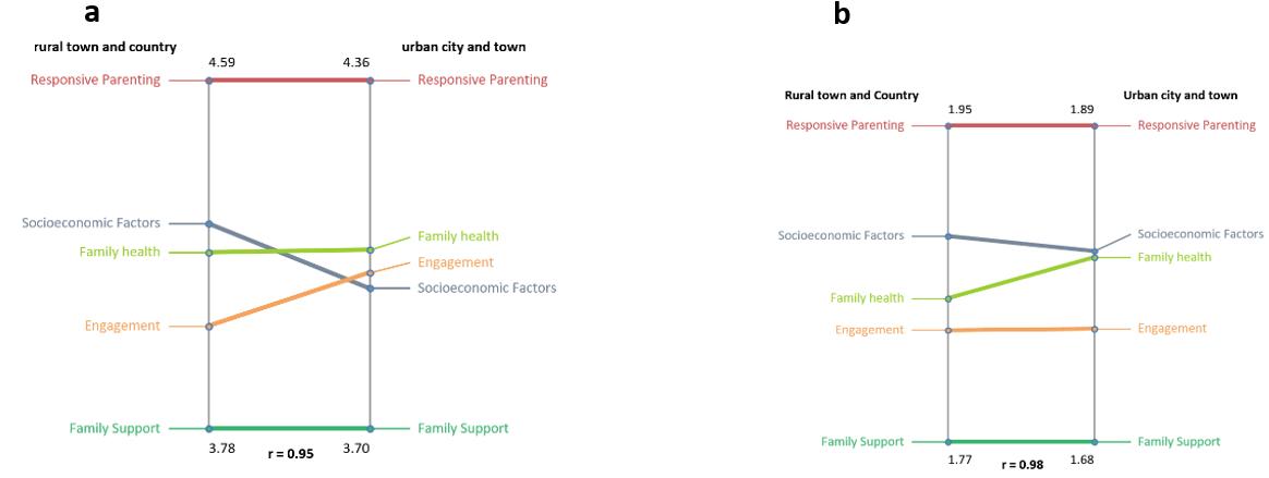Figure 7: Pattern matching rural town and country versus urban city and town participant rating of the five clusters in accordance with (a) importance and (b) essentialness.