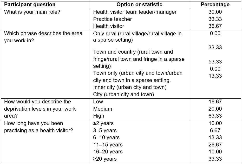 Forty eight health visitors completed the study demographic questions. They included health visitor team leaders/managers (30%), practice teachers (33%) and health visitors (37%). They were generally very experienced health visitors, with 70% having practised for 11 years or more. Only 13% worked in the city while the remainder worked in towns and in the country. Sixty three per cent (63%) described their work area as an area of high deprivation (Table 1). The study used a modified version of the Office for National Statistics’ Rural Urban Classification to construct the categories in discussion with the stakeholder group. Health visitors were then asked to self-identify their practice location39. The 2011 rural–urban classification provides a rural/urban view of datasets at output area, super output area and ward level (Fig1).