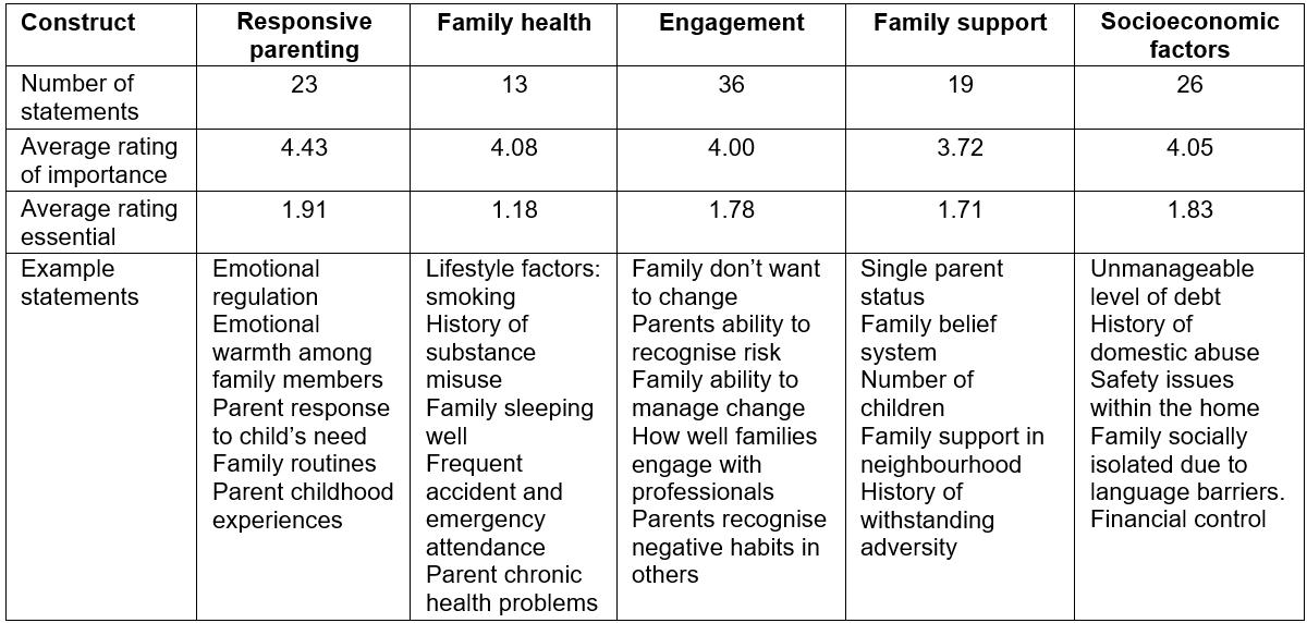 The ‘family support’ construct of family resilience comprised 19 characteristics and included statements about relationships, parental status and age, family belief system, family structure, family communication, accessibility, number of children and history of withstanding adversity. Health visitor participants considered this construct the least important of all five clusters, at 3.72. Educating children and families about respectful and healthy relationships is important to reduce the risk of abuse14. It is reliant upon the therapeutic working relationships and engagements with the services put in place to support families or provide these interventions.