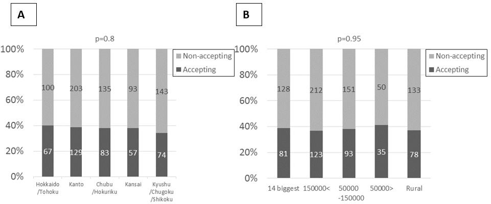 Figure 1: Acceptance of practice by interns in Japan by (a) region, (b) population of municipality.