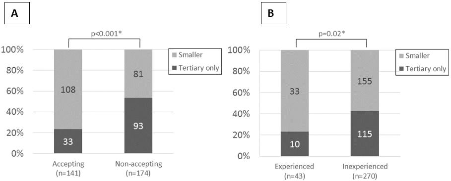 Acceptance of care provision by interns was not associated with region (p=0.8, Fig1a), population of municipality of residence (p=0.9, Fig1b) or age group (45.6%, 15–19 years; 43.4%, 20–29 years; 36.6%, 30–39 years; 38.2%, 40–49 years; 33.0%, 50–59 years; and 38.9%, ≥60 years; p=0.3). Those who were willing to accept care from interns were statistically more likely than others to express understanding that interns needed experience of providing care (accepting 91.6% (207/226) vs non-accepting 41.4% (143/345), p<0.001; experience 76.0% (57/75) vs no experience 59.3% (293/494), p=0.006). Participants who were willing to accept care from interns were also statistically more likely to respond that interns would have more opportunities to be trained at smaller or community hospitals than at tertiary hospitals (p<0.001, p=0.02, Fig2). This tendency was consistent across municipalities, regardless of population (57.5% for larger cities, 60.2% for municipalities with populations of over 150 000, 65.3% for municipalities with populations of 50 000–150 000, 57.1% for municipalities with populations <50 000, and 56.3% for rural areas; p=0.8). Satisfaction with care provision by interns was highest among those who had been seen in ward settings (73.9%, 51/69) and lowest in those who had been seen in an emergency room (33.3%, 2/6).