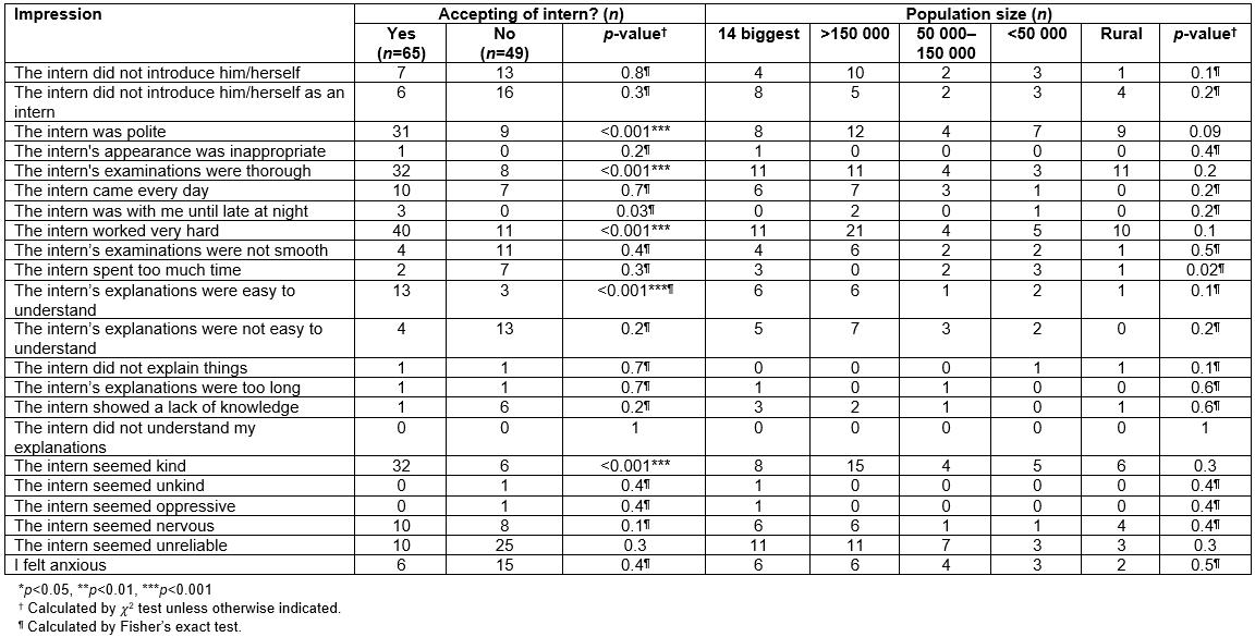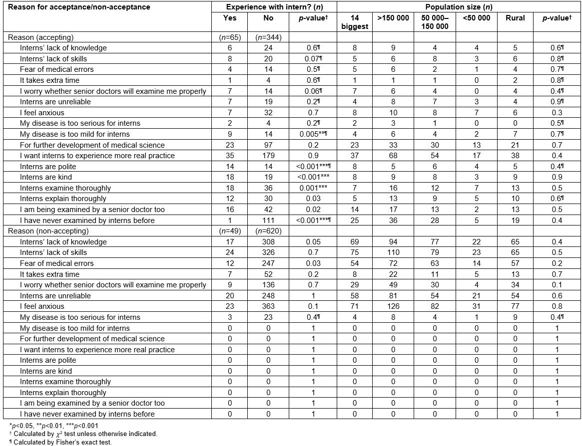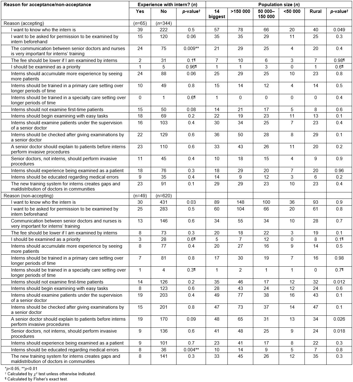 Table 2: Acceptance or non-acceptance of care provision by interns, by reason
