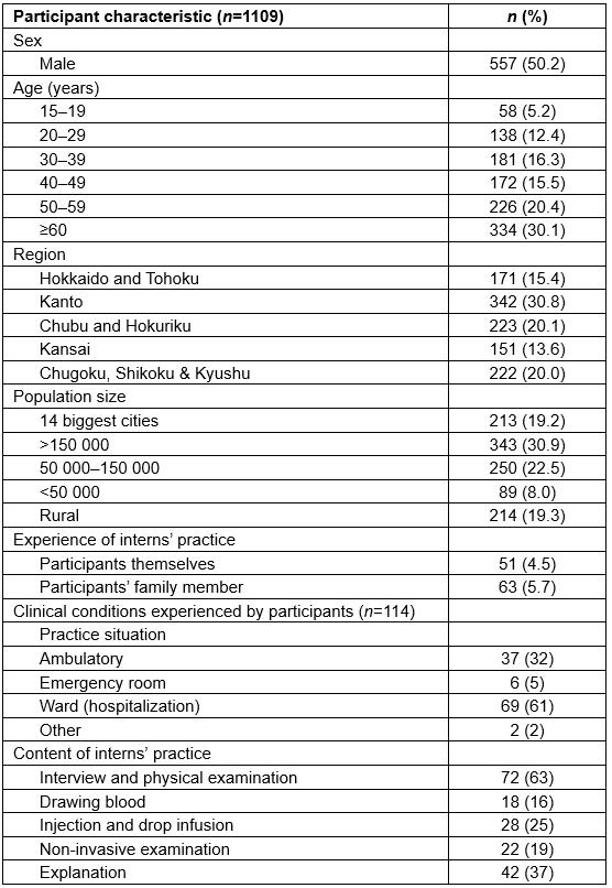 The sample data were representative of the Japanese population (128 million residents; mean age 43 years; 49% men (2005 census)). A total of 1109 (46%) participants completed the questionnaire. The gender ratio and mean age were consistent with the 2005 Japanese census (Table 1). In total, 10.2% (114/1109) of participants had received medical care from interns, of whom 4.5% (51 respondents) had direct experience. The other 5.7% (63) had experience of care provided by interns through a family member (indirect experience). Participants’ responses indicated that the situations most commonly involved hospitalization (60.5%), outpatient clinics (32.4%) or emergency room visits (5.2%).