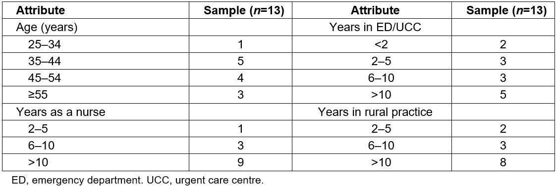Participants were purposively sampled. Registered and enrolled nurses who were employed by the participating hospitals to work in ED or UCC on any basis (casual, full-time or part-time) were invited to participate in an interview. Student nurses were excluded from the selection criteria. Sites included one rural emergency department and two urgent care centres located between 90 and 110 km by road from the nearest regional hospital with a mental health inpatient unit in south-west Victoria. All sites had access to a community mental health team during business hours but had limited or no onsite support after hours. Telephone triage services based at the nearest regional hospital were accessed by all sites after hours. Only one site had occasional face-to-face assessments conducted after hours by a local mental health clinician.