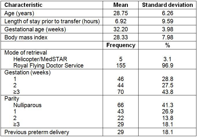 Table 1: Descriptive statistics for acute antenatal transfers (n=160) from Riverland region, South Australia, 2010–2015