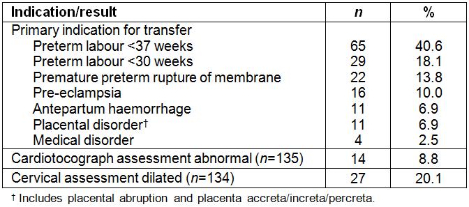 During the study period, there were 160 acute antenatal transfers. Five women were transferred twice during their pregnancy and one woman was transferred three times. Over 5 years, there were approximately 1669 births from this region, giving a region-wide transfer rate of 87 transfers per 1000 births. There were 32 neonates transferred during the same time period. A total of 149 (93.2%) transfers occurred before 36 weeks’ gestation; and of these, 99 (66.4%) delivered before 36 weeks (Table 1). Indications for transfer are shown in Table 2.