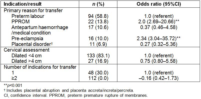 A logistic regression analysis was performed to assess the impact of several factors on likelihood of delivery on transfer (Table 3). Pre-eclampsia and PPROM were associated with increased likelihood of delivery on transfer. Gestational age, total number of risk factors, placental problems, premature labour and cervical dilation did not make a significant contribution to the model.