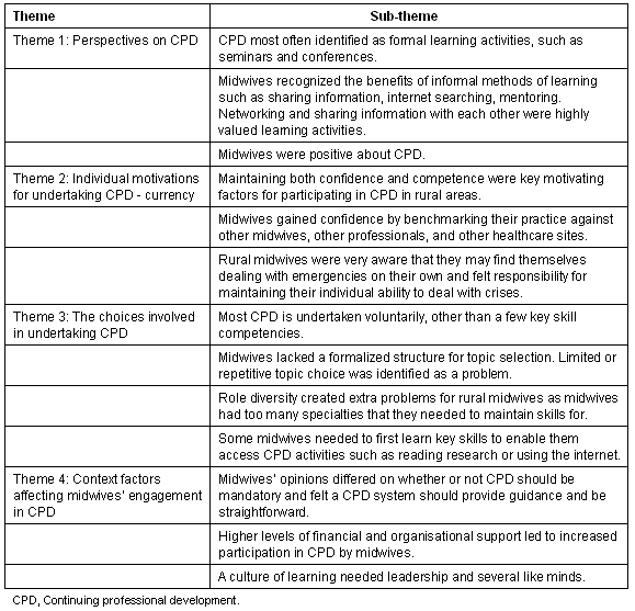 The four key themes emerging from the data were: (i) midwives' views of CPD; (ii) their motivations for undertaking CPD; (iii) the choices they make around CPD; and (iv) how context factors facilitate their involvement in CPD (Table 1). These data have implications for the development of a CPD framework.