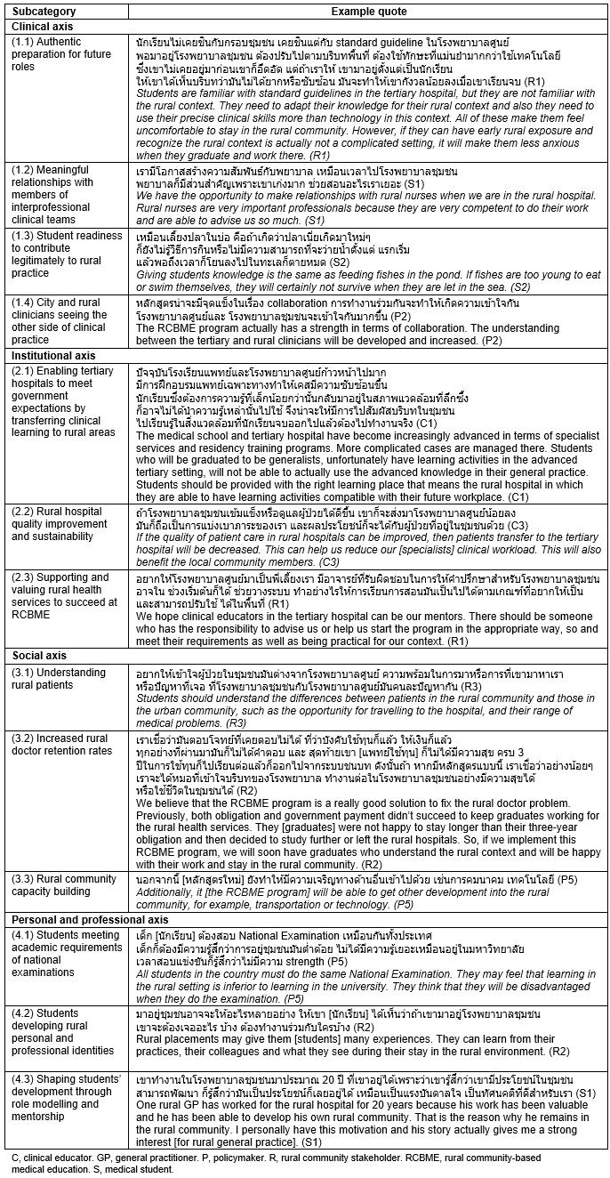 The clinical axis: clinician–student–patient relationship: Participants expected Thai RCBME would be able to provide students with an authentic preparation for future roles in rural general practice. Overall stakeholders described this as fit-for-purpose for students’ development of generalist competencies, and would allow students to be informed about the process of patient management in the primary health services and transfer to the tertiary hospital. It was thought that students would gain more clinical experience when they engaged with their clinician supervisors and patients in an active role allowing continuity of learning and patient care. Additionally, students could learn to value the expertise of other health professionals in rural areas and could broaden their perspectives of interprofessional practice. Furthermore, not only students, but also clinicians in different health services would benefit from understanding the perspectives of the different rural and city health services and develop professional relationships across these services through an RCBME program. However, rural community participants expressed concerns about students’ expertise in clinical practice and were not comfortable about student readiness to contribute legitimately to consultations, which they were concerned would take longer.