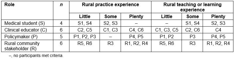 Twenty one purposively selected participants included medical students (S; n=4), clinical educators (C; n=6), regional health policy makers (P; n=5) and rural community stakeholders composed of three rural GPs, one rural nurse and two local community members (R; n=6). The participants demonstrated a range of rural practice experience, and rural teaching or learning experience across all groups (Table 1). Findings are presented below in two parts, first within the symbiosis axis categories (Table 2) and second as the results of the cross-category analysis of themes (Table 3).