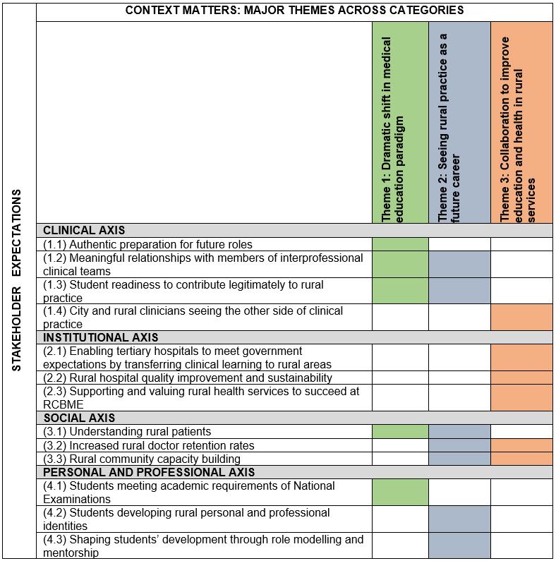 Results of the first round of analysis according to the symbiosis theoretical framework revealed stakeholders’ perspectives on each set of relationships and how these might manifest within an RCBME program. In each axis the subcategories (Table 2) define the hopes for the local expression of RCBME and challenges associated with these.