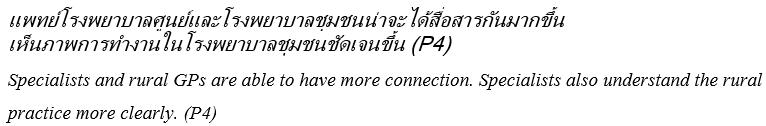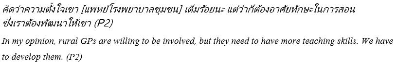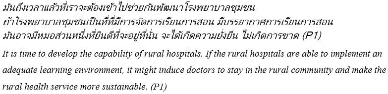 Theme 2: Seeing rural practice as a future career: Participants expressed a hope, with caution, that if all stakeholders could envision an optimistic future for rural practice, then each group of stakeholders will positively reinforce the RCBME work and outcomes of each other. Their visions include a future for (1) Thai rural doctors as educators; (2) rural Thai patient health care and (3) CPIRD students as well-educated rural doctors.
