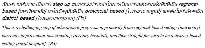 Theme 1: A dramatic shift in medical education paradigm: Participants recognised that the RCBME proposal was a significant new direction for Thai medical education. This shift included (1) a shift of location, (2) a shift of clinical content, (3) a shift of educational focus and (4) a shift of outcome.