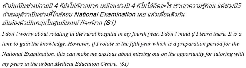 Internationally, RCBME was initiated as an educational strategy in the Australian context in 1997 with the aim of improving the recruitment and retention of rural general practitioners (who, in the Australian context, have postgraduate speciality qualifications in primary care)21. This strategy included fostering medical students with rural backgrounds and early exposure to rural practice, with a view to encouraging more junior doctors to practise in rural communities7,21. In the Thai context, this educational change has significant implications including the need to adequately prepare students and rural clinicians for apprenticeship learning. Student concerns about the national examinations mean there is a need to consider the alignment of national assessment with contemporary clinical learning. Alignment of assessment with teaching is important to guide the desired learning behaviour22. The risk otherwise is that the desired apprenticeship learning of RCBME may be undermined by misaligned assessment. This is compounded in Thailand where the national examination is both highly specialised and administered in English.