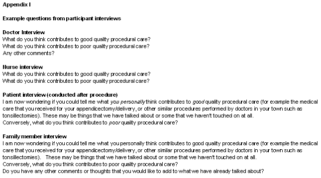 A central issue remains: how should an assessment of quality of rural procedural medical care be approached? Models for quality indicators that do not rely on high obstetric caseloads are in development12,13, although this is less well developed in surgery14. This article reports a study that, as part of a broader study of the quality of care in a series of real clinical cases15, explored the understanding of what determines 'quality' from the perspectives of the participants in rural procedural health care: the patients, their families, the doctors and the supporting health professionals.