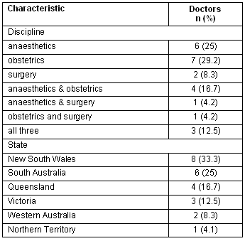 Recruitment of doctors and patients was more difficult than expected, particularly for surgical procedures. Doctors from States with substantial rural procedural medical practice comprised a majority of responders. Although 49 doctors agreed to participate, only 24 successfully recruited patients. Those who withdrew cited time management problems, particularly for more urgent procedures, when there was little time to obtain formal consent, distribute questionnaires and arrange telephone interviews. Hence, the majority of cases included in the analysis were elective procedures or, in the case of obstetric patients, at least known of in advance. Of the 24 doctors who did continue, all but one were male, with an average age of 49.4 (±6.5) years and range of 34-59 years. These doctors reported having spent a mean of 18.1 (±7.4) years in rural practice (responses ranged from 5-30 years). Those doctors not contributing cases were very similar demographically (age, gender, experience and distribution).