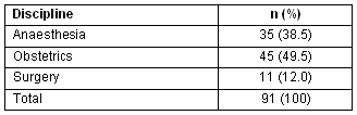 Tables 1 and 2 summarise the location and discipline of participating doctors and the numbers of procedures by discipline. Most anaesthetic procedures were general anaesthesia. A majority of obstetric cases were normal vaginal deliveries, and the rest were assisted deliveries, including nine Caesarean sections. All 11 surgical cases were relatively minor procedures (mostly simple excisions and endoscopies). The patients were mostly female (78%), had a mean age of 39 years, and were in long-term relationships (59%).