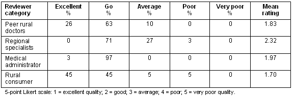 The quality ratings of case reviews by the rural consumer representative, medical administrator, peer rural doctors and urban specialists are summarised (Table 3). Reviewers were asked to rate the quality of care for each case from 1 to 5 (where 1 = excellent; 5 = very poor). The difference in these results achieved statistical significance (Pearson c2 value 89, df = 8, p <0.05), with the regional specialists rating the quality least highly, although this was due to greater use of the 'good' category rather than higher use of 'poor' categories.