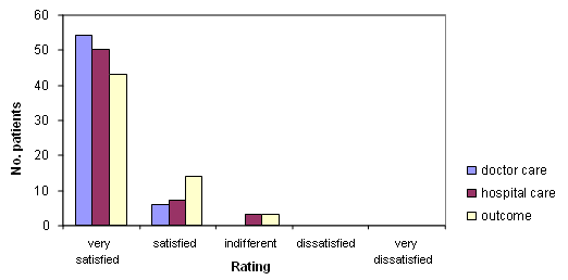 Patient satisfaction was high, as summarised (Fig 1). Overall, 83% (50) of patients indicated that they were 'very satisfied' with the care that they had received throughout their treatment. A further seven patients indicated they were 'satisfied' and three responded with 'indifferent'. A majority were 'very satisfied' with their doctor (90%; 54) and after hospitalisation, 95% (57) of patients indicated that they were either 'very satisfied' or 'satisfied' with the care they received at hospital.