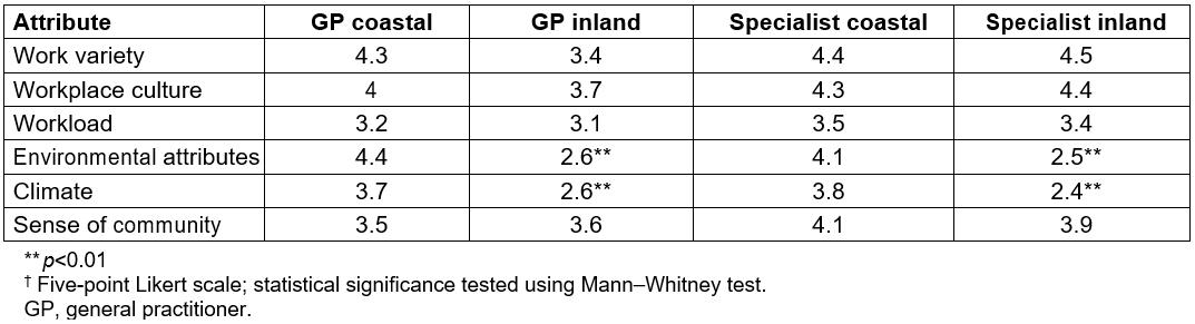 Our quantitative results (Table 1) confirm that recruitment and retention in these regional centres is multifactorial. Environmental attributes such as the beach, and professional factors such as work variety and workplace culture, had high rankings for GPs and specialists resident in coastal locations. In contrast, their inland counterparts had significantly lower values for location factors but similarly high values for professional factors. One clinician noted: