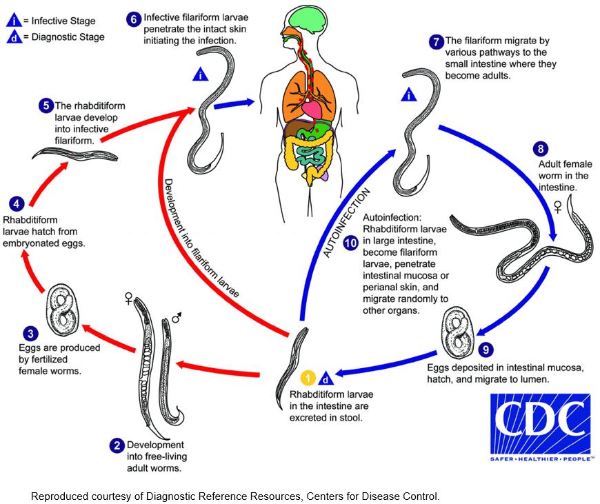 After skin penetration, the larvae migrate into capillaries to enter the venous circulation to return to the lung. There they are coughed and swallowed to enter the bowel, where the worm can mature. The process of parthogenesis means an individual adult parasitic female worm can replicate new generations of viable eggs within the human host without contact with other worms or the soil1. These viable eggs can mature in the intestine with subsequent larval penetration of the lower rectum. Autoinfection occurs with larval re-entry to the venous circulation, taking larvae to the lung. Random migration to other organs may also occur. The patient’s immune system can keep Strongyloides numbers at a relative stable number. The vast majority of patients with positive S. stercoralis serology are asymptomatic.