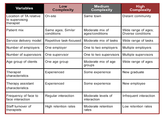 Supervision has three important functions. First, supervision provides education and develops skills in those under supervision18. Second, supervision provides support. This includes personal validation, planning, feedback and refection18. Finally, the managerial role of supervision is critical in monitoring quality of care and protecting the welfare of clients seen by unqualified staff or those in training18,19. The rural context is a complex environment for supervising TA practice. Lowe14 has outlined a number of variables contributing to a lesser or greater degree of complexity to the TA work setting (Fig 1). Factors including the location of the AHP and TA, diversity of client mix, and number and experience of TA and supervisors influence the degree and methods required for supervision in a rural or remote context.