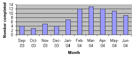 Figure 3: The number of completed supervision logs received from therapy assistants per month, September 2003 - June 2004.