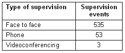 Investigation of videoconference records indicated limited use of videoconferencing for supervision. Since the introduction of minimum standards of supervision there were only three recorded sessions of supervision by videoconferencing. Table 1 displays a comparison of methods used for supervision during the duration of the TAP.