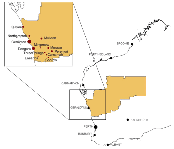 Figure 2: The WA Country Health Service - Midwest Murchison Region showing the site of the Therapy Assistant Project.