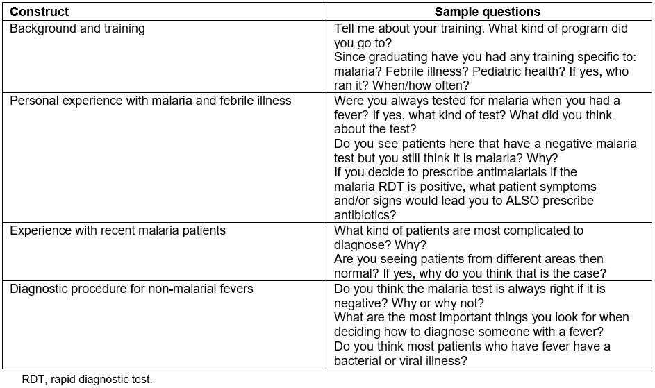 For the key informant interviews, all health providers on the mobile clinics were approached, and all agreed to participate. Each participant provided written, informed consent (available in both English and Chichewa). Interviews were semi-structured and focused on site- and provider-level factors that influence treatment of patients presenting with a negative mRDT. Questions included content on (1) providers’ training and clinical experience, (2) approach to determining a diagnosis in light of a negative mRDT, (3) availability or use of clinical diagnostic tools, and (4) familiarity with the etiologies and management of non-malarial fevers (Table 1). A trained team of local, independent consultants conducted all interviews. Interviews were conducted in Chichewa, translated, transcribed, and uploaded to a secure database.