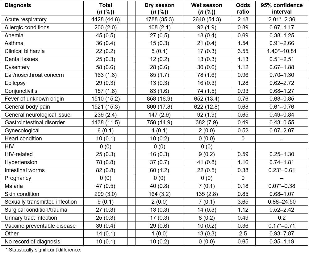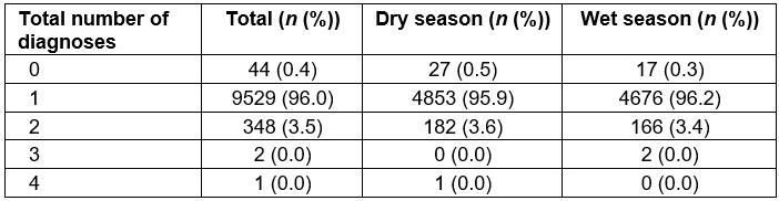 The official recording of multiple diagnoses was quite rare, with 96.0% of patients receiving only one, 3.5% receiving two, 0.4% receiving no official diagnosis, and the remaining <0.1% (n=3) having three or more (Table 5). Acute respiratory infection was the most common diagnosis for mRDT-negative patients (44.6%), and this number increased in the rainy season as compared to the dry season (54.3% v 35.3%, respectively, OR=2.18, 95%CI=2.01–2.36). The second most common diagnosis was general body pain (15.3%), with significantly fewer cases diagnosed in the wet season compared to the dry season (12.8% v 17.8%, OR=0.68, 95%CI=0.61–0.76), followed by fever of unknown origin (15.2%), also seen less frequently in the wet season compared to the dry season (13.4% v 16.9%, OR=0.76, 95%CI=0.68–0.85). The only additional diagnostic category representing greater than 10% of all diagnoses was gastrointestinal disease (11.5%), with a significantly lower number of cases seen in the wet season when compared to the dry season (7.9% v 14.9%, OR=0.49, 95%CI=0.43–0.55). Table 2 shows all diagnoses given during the study period.