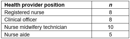 Background and training: The range of experience among the health providers on the mobile clinics was expansive. Seven clinical officers were interviewed, with experience ranging from 7 to 35 years. Nurses interviewed included student nurses, nurses’ aides, and nurse midwifery technicians. Training in pediatrics was limited, with most health providers stating they learned on the job.