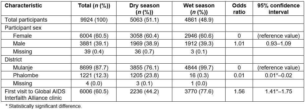 Out of the 9924 mRDT-negative patient records examined over the 4-month period, 6004 (60.5%) were female compared to 3881 (39.1%) males (Table 4). There was no significant difference in the number of female versus male patients in the dry and wet seasons. The majority of patients were from Mulanje district (87.7%), with a smaller percentage coming from Phalombe district (12.3%). Approximately 32 days (27%) of logbook data from the Phalombe district were unavailable for review during the wet season analysis. To assess whether this would bias the subsequent analyses, a full comparative analysis was run comparing Phalombe patient characteristics to the rest of GAIA patents overall and by season. No significant differences were found. First-time patients were significantly more likely to visit mobile clinics in the wet season compared to the dry season (OR 1.56, 95%CI=1.41–1.75).