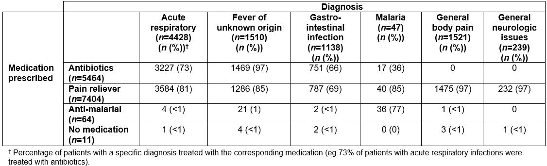 Table 6: Diagnosis and corresponding medication prescribed for malaria rapid diagnostic test negative patients from retrospective logbooks for five most frequent diagnostic categories, June–July 2016 and November–December 2016