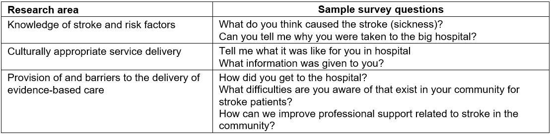 Surveys that included open-ended questions were administered through interviews with 104 participants (10 carers, 24 stroke survivors from 1 month to 5 years post-stroke, and 70 stakeholders). These interviews took place in 18 regional, rural and remote sites between June 2012 and November 2013. The interviews were conducted in stroke survivors’ homes, community facilities, hospitals and primary health care centres. The surveys were specific to each participant group and were designed to elicit illustrative comments around the research areas described in Table 1.
