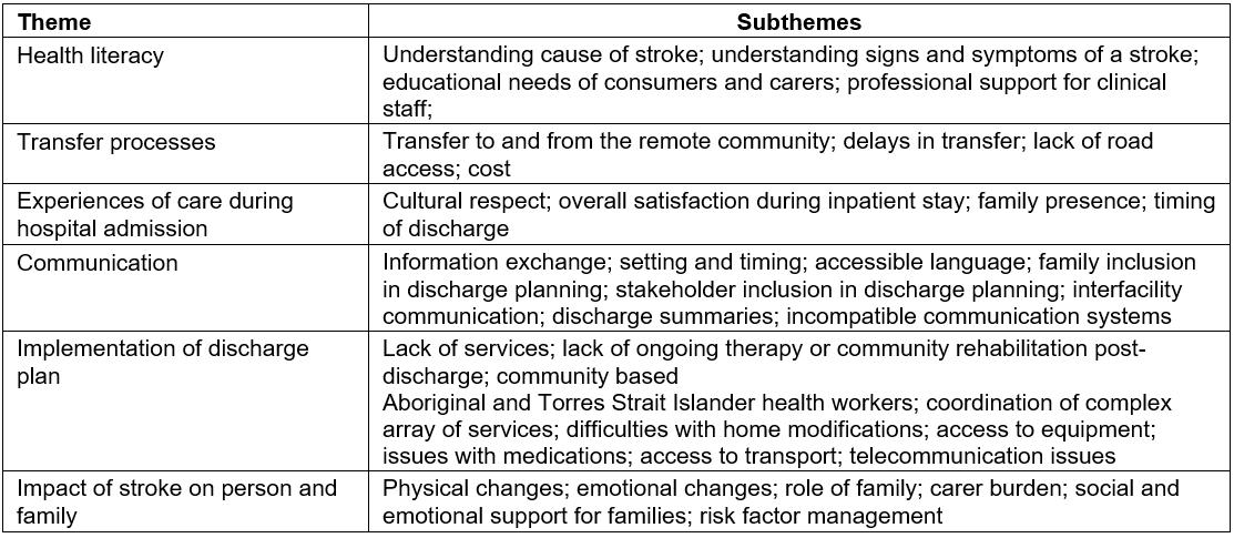 Data were grouped into six broad themes and related subthemes as shown in Table 2. The themes are presented as a representation of the patient journey from the perspectives of stroke survivors, carers and stakeholders.