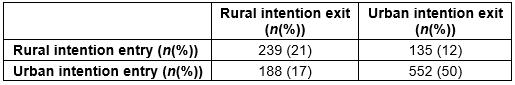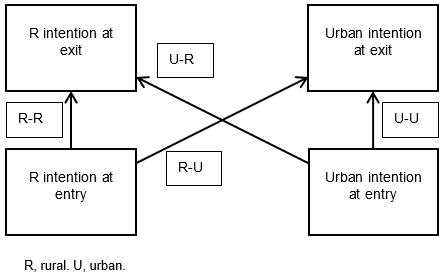 There was a specific focus on the characteristics of three groups: the rural ‘persisters’ (those with rural intention at both entry and at exit) and the two groups of ‘changers’ (those who change intentions from rural at entry to urban at exit, or from urban at entry to rural at exit).
