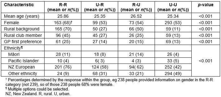 Medical students who persisted with a rural career pattern (R-R) had characteristics of coming from a rural background (70%), being female (68%), identifying as NZ European (76%) or having involvement with a rural club for at least 1 year (45%). These students were also more likely to express a GP career intention as their first choice (25%). Post-hoc analysis showed that students who changed away from a rural intention during their time at medical school (R-U) were significantly older than U-U (p<0.001) and U-R students (p=0.002). Apart from a slightly higher age in the R-U group, and 50% of the R-U students having a rural background, no particular demographic factors were associated with students who changed.