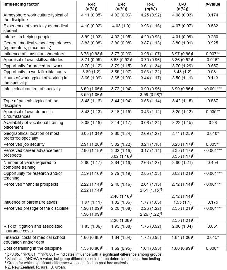 The rural ‘persisters’ were less influenced by consultants/mentors, the intellectual content of the specialty, job security, perceived career advancement prospects, opportunity for research and/or teaching, perceived financial prospects, perceived prestige of the discipline, financial costs of medical school education and/or debt and the cost of training in the discipline. They were more influenced by geographical location.