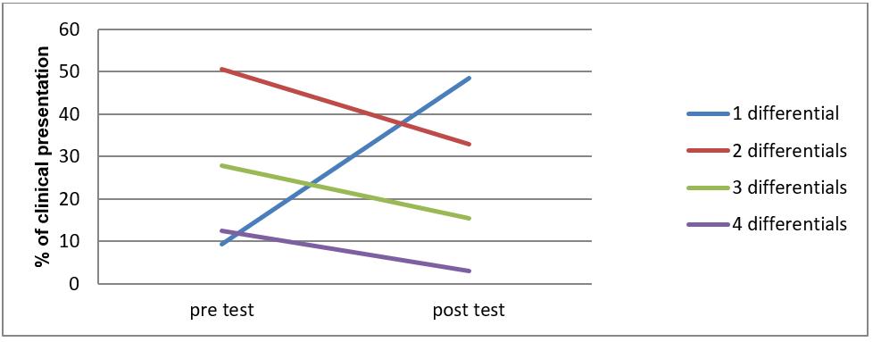Differential diagnosis: Changes in the number of differential diagnoses before (pre) and after (post) the test are illustrated in Figure 1. The average number of differential diagnoses reduced from 2.43 (pre-test) to 1.7 (post-test) (χ2 tests p<0.05). In 42 (43%) cases, differentials dropped by one. For a small number of cases (3%) having access to the test increased, rather than reduced, the number of differentials.
