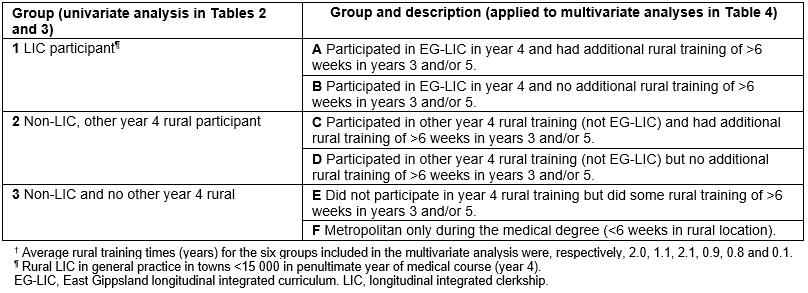 With this background in mind, this study aimed to compare the work location outcomes (regional or more rural) of medical students who completed 1 year of the rural EG-LIC in general practice in year 4 with, first, students having other rural training in year 4 and, second, students having no rural training.