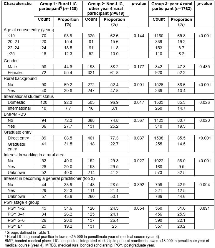 Compared with students with non-LIC year 4 rural training, LIC participants were more likely to be graduate-entry or international students and less likely to have an interest in working in a rural area at entry to medical school and a rural background (Table 2). Compared with students with neither LIC nor year 4 rural training, LIC participants were more likely to be older, have a rural background, graduate entry enrolment, be rurally bonded, have an interest in working in a rural area or in being a general practitioner at entry to medical school and be less likely to be international students.