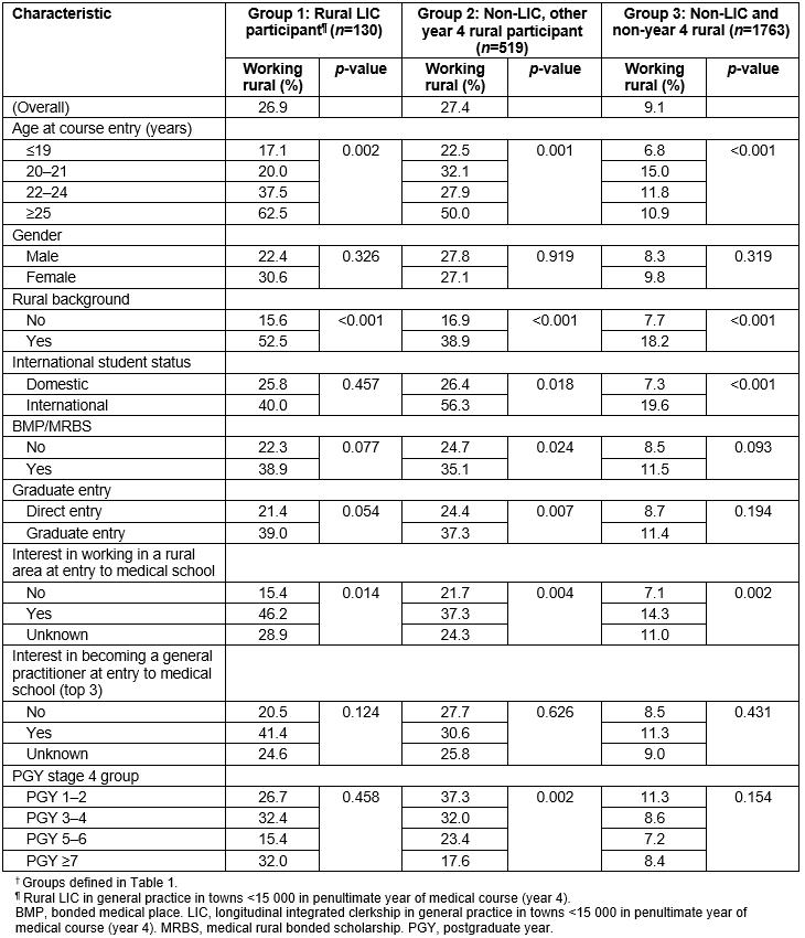 The overall rates of working rurally in 2017 were 26.9%, 27.4% and 9.1% respectively for the LIC, non-LIC for other year 4, and non-LIC and non-year 4 rural training groups (Table 3). Between each of these three groups rural background, initial rural interest and age at entry were significantly different (p<0.05).