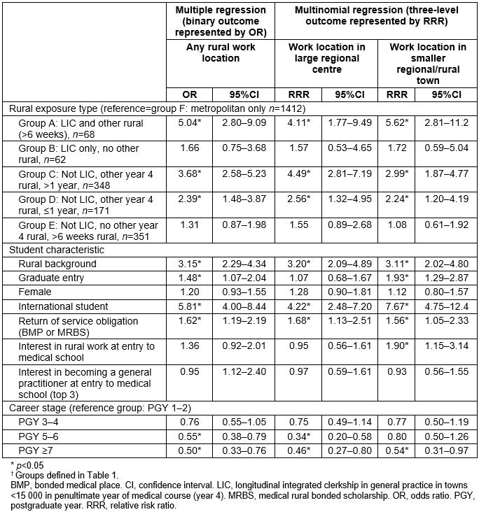 Students who had participated in the LIC group with additional rural training in years 3 and/or 5 of the course (group A) had the strongest odds of working in smaller regional or rural towns (population size<50 000) (OR 5.62, 95%CI 2.81–11.20). Students in this group (group A) also had strong odds of working in large regional centres (≥50 000 population) as did the non-LIC year 4 rural group (group C) (OR 4.11, 95%CI 1.32–4.95 and OR 4.49, 95%CI 2.81–7.19, respectively).