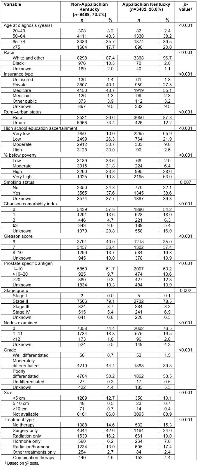 Despite being the most commonly diagnosed malignancy in men in the USA1, and differing findings from across the Appalachian region, PC in Appalachian Kentucky has not been well studied. Therefore, the purpose of this study was to conduct a population-based survival analysis of PC focused on comparisons between Appalachian Kentucky and non-Appalachian Kentucky.