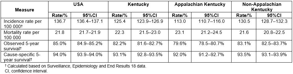 Table 3: Age-adjusted incidence and mortality rates of prostate cancer in Appalachian Kentucky, non-Appalachian Kentucky and USA, 2010–2014